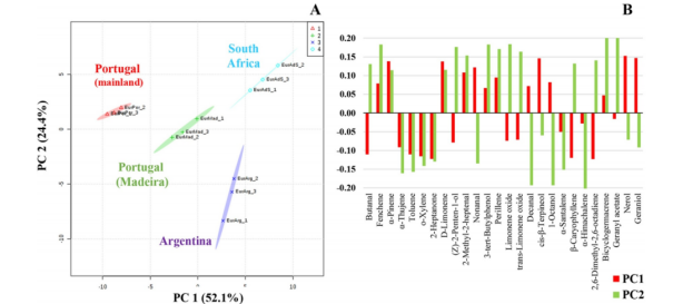 從圖中可以看到,PCA的第一個主成分(PC1)總方差為52.1%,可以將檸檬生長在葡萄牙大陸和馬德拉的品種進行區(qū)分,(乙醇、乙酯,辛酸、反式-βα,紫蘇醛和揮發(fā)性有機物揮發(fā)性有機物)。第二主成分(PC2)占模型總方差的24.4 %,并將南非生產(chǎn)的品種與阿根廷生產(chǎn)的品種(α-pinene、 α-thujene、甲苯、甲苯、1-丁醇、d-檸檬烯和2-甲基-2-庚烯)分開。