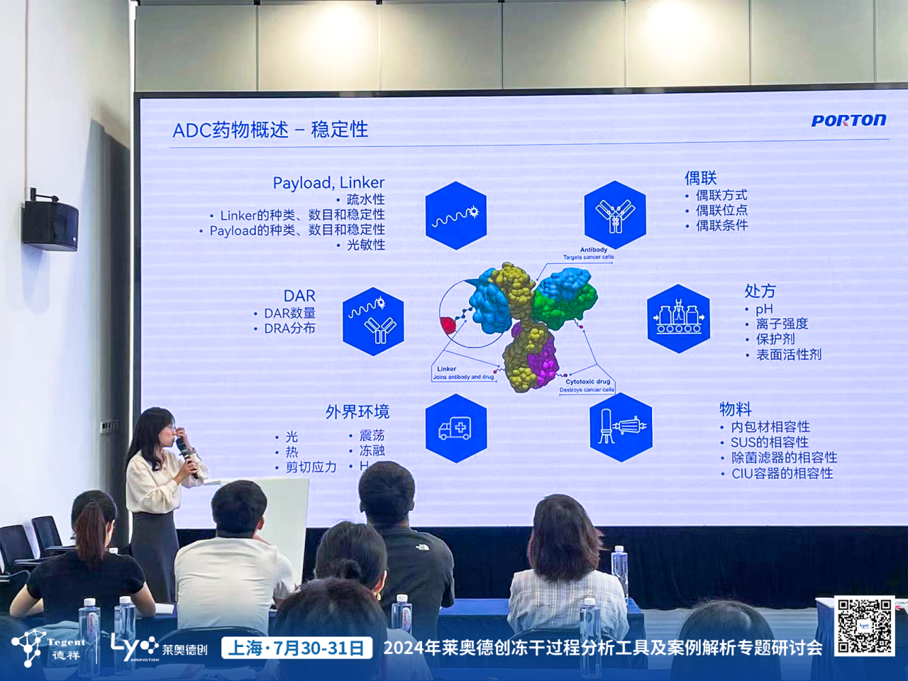 來自博騰制藥的盧懿則帶來了行業(yè)內(nèi)大家都關(guān)心的又一熱點(diǎn)——ADC制劑研發(fā)。已上市的ADC藥物大部分都采用了凍干工藝。而在本次研討會中,盧總分享了自身的研發(fā)經(jīng)驗(yàn)以及與萊奧德創(chuàng)實(shí)驗(yàn)室合作,使用Lyostar4.0凍干機(jī)開發(fā)凍干工藝的經(jīng)驗(yàn),分享了Rp對ADC凍干工藝開發(fā)的指示作用。通過與現(xiàn)場導(dǎo)師的深入交流,也讓學(xué)員們對于這一熱門賽道以及凍干PAT工具的作用有了更多思考。